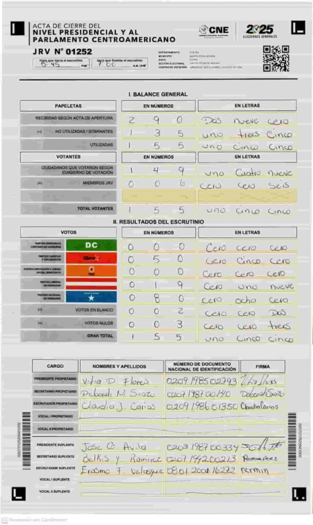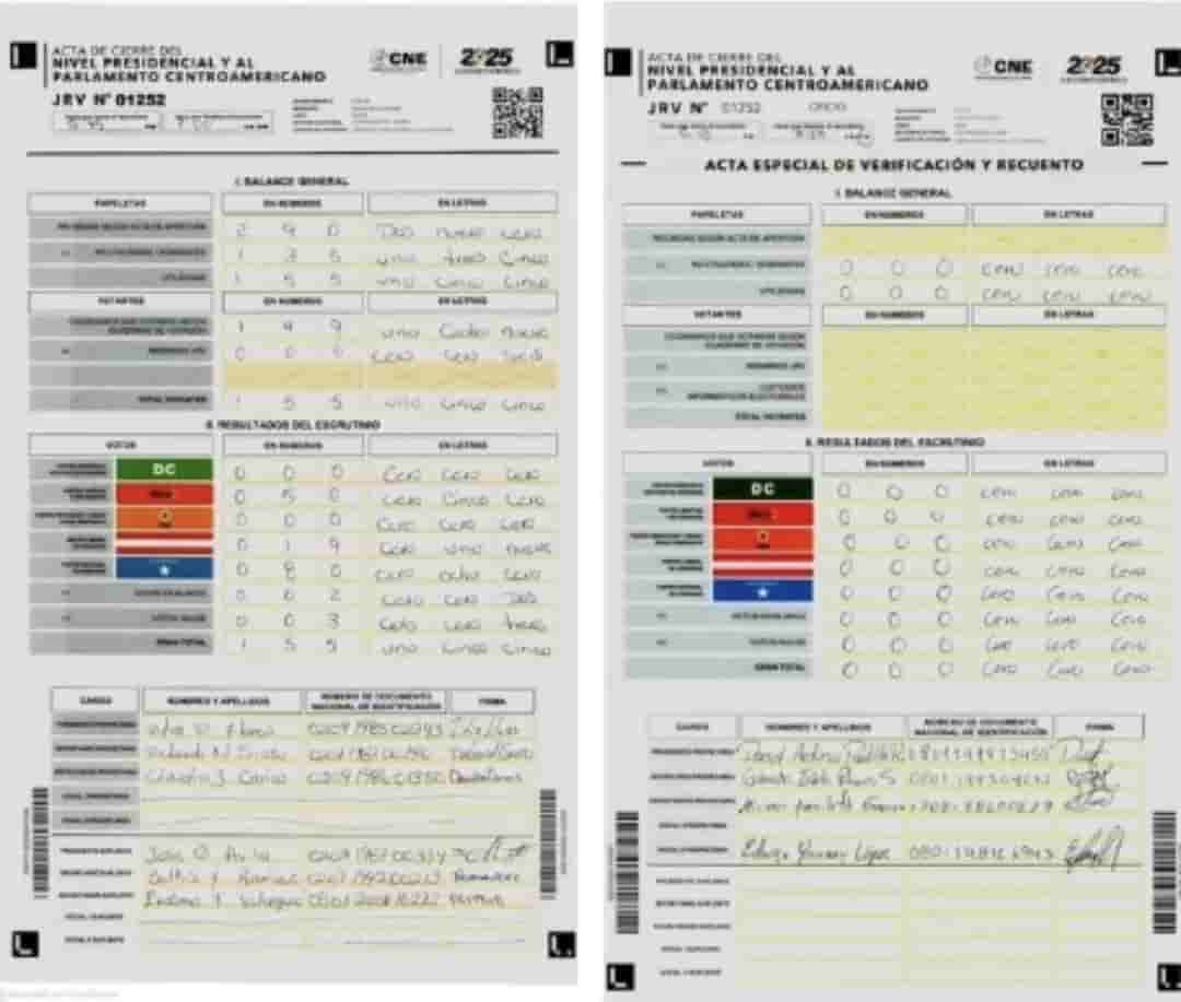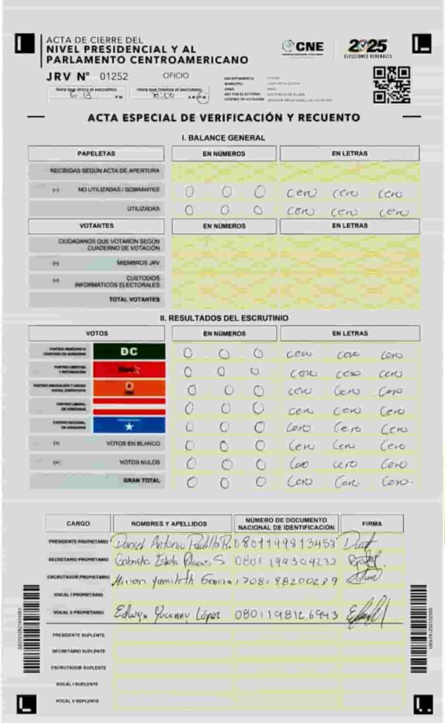 Henry Villeda, encargado de capacitaciones de mesa, aseguró que el acta “está perfecta”, sin borrones y con números, sumas y firmas correctas. A su juicio, la única razón técnica para la anulación podría estar relacionada con inconsistencias entre el cuadernillo y las marcas de los votos reflejados en el acta, extremo que —dijo— debe verificarse revisando el cuadernillo correspondiente.