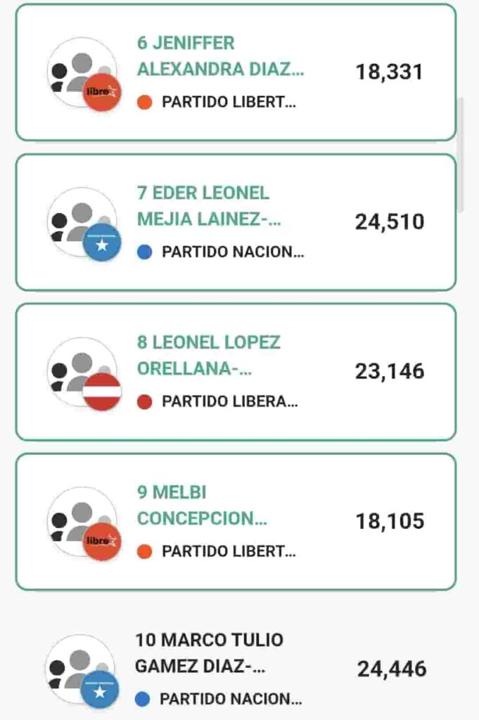 La tendencia preliminar sugiere una distribución equilibrada entre los tres partidos mayoritarios, con el Partido Nacional y el Partido Liberal dominando la parte alta del listado, mientras Libre mantiene tres posiciones competitivas.