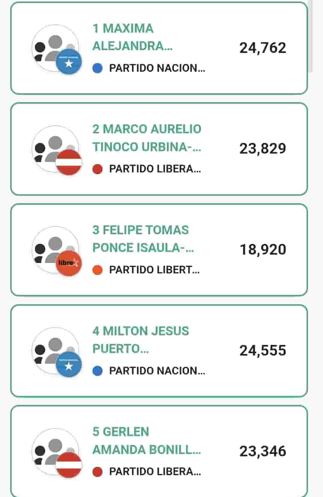 La tendencia preliminar sugiere una distribución equilibrada entre los tres partidos mayoritarios, con el Partido Nacional y el Partido Liberal dominando la parte alta del listado, mientras Libre mantiene tres posiciones competitivas.