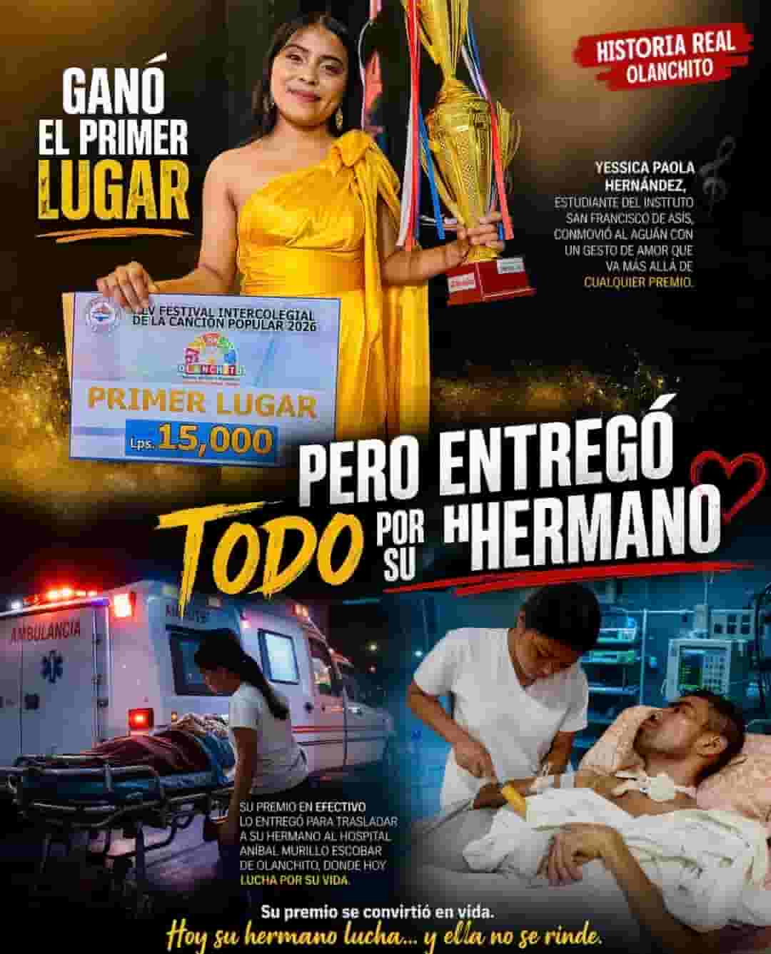 Olanchito, Yoro — Lo que comenzó como una noche de música y competencia en el Festival Intercolegial del Instituto Francisco J. Mejía terminó convirtiéndose en una historia de fe, sacrificio y amor familiar. Yessica Paola Hernández, estudiante del Instituto San Francisco de Asís y originaria de Esquipulas del Norte, Olancho, no solo ganó el primer lugar del certamen, sino que entregó la totalidad de su premio en efectivo para trasladar de emergencia a su hermano al Hospital Aníbal Murillo Escobar de Olanchito.