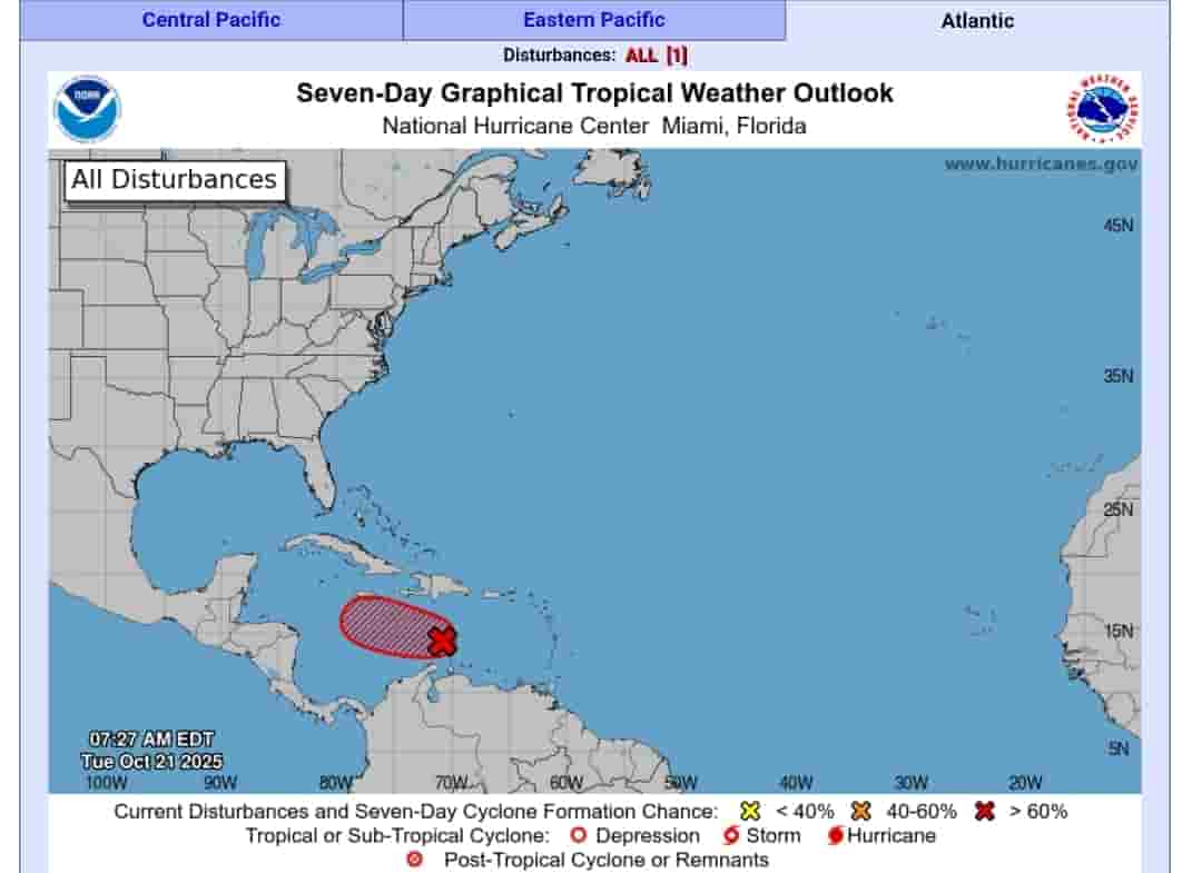 El Centro Nacional de Huracanes (CNH) de Miami, Estados Unidos, informó este martes que una perturbación tropical en el mar Caribe oriental presenta un 90% de probabilidad de convertirse en ciclón tropical en los próximos días, situación que mantiene en alerta a los países de la región, entre ellos Honduras, por los riesgos de lluvias intensas, vientos fuertes y oleaje elevado.