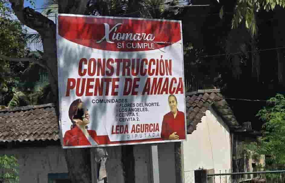 Los carteles —instalados en distintas comunidades como Tepusteca, Colonia Dan Martin y Armenia — anunciaban con letras grandes obras del gobierno actual, entre ellas la construcción del puente de Amaca. Hoy, sin embargo, la mayoría han sido dañados o destruidos.