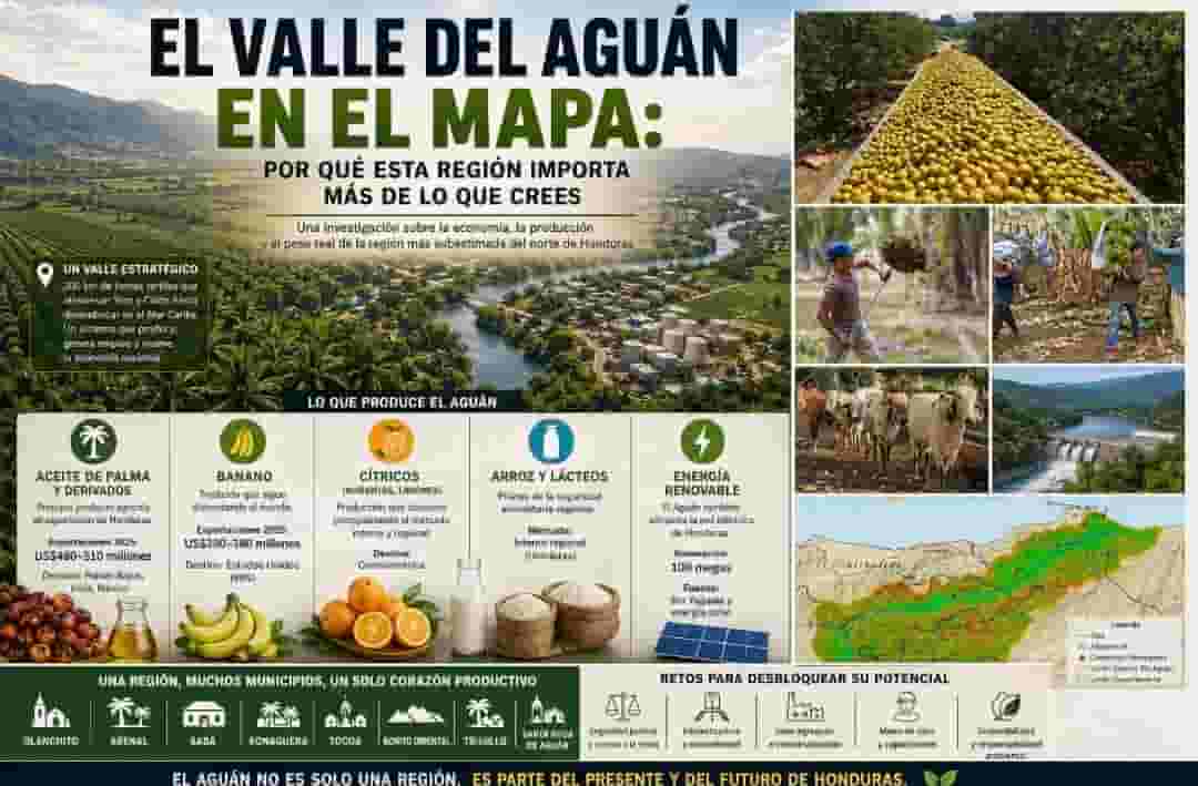 El Valle del Aguán — ese corredor que atraviesa los departamentos de Yoro y Colón, y que incluye municipios como Olanchito, Arenal, Sabá, Sonaguera, Tocoa, Bonito Oriental, Trujillo y Santa Rosa de Aguán, entre otros — es uno de los territorios agropecuarios, energéticos y agroindustriales más importantes de Centroamérica. Y sigue siendo, en gran medida, invisible para el análisis económico nacional.