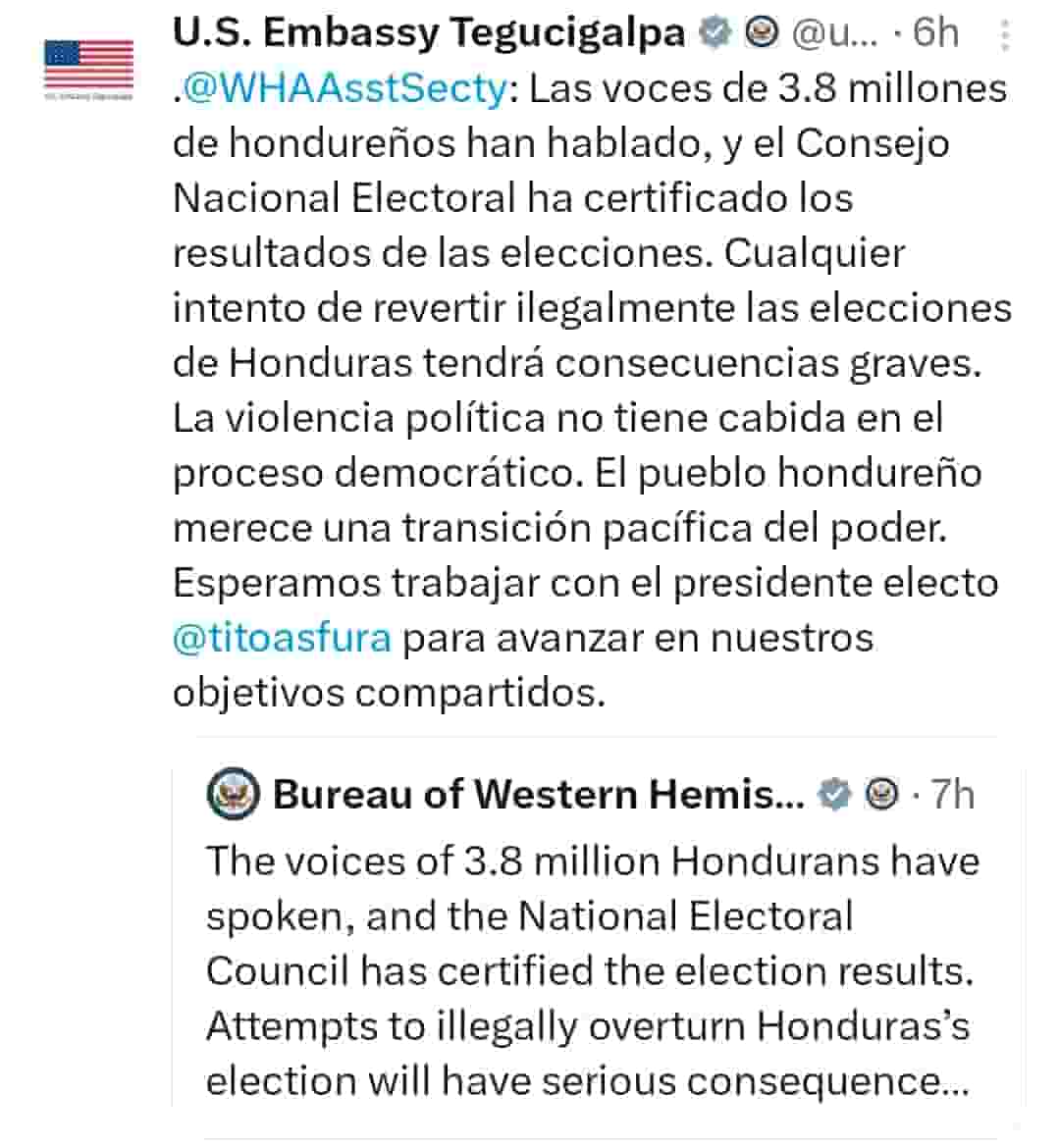 En un pronunciamiento del Buró de Asuntos del Hemisferio Occidental, Washington subrayó que las “voces de 3.8 millones de hondureños han hablado”, y remarcó que cualquier acción orientada a desconocer la voluntad popular expresada en las urnas carece de legitimidad y tendrá repercusiones.