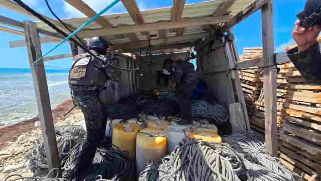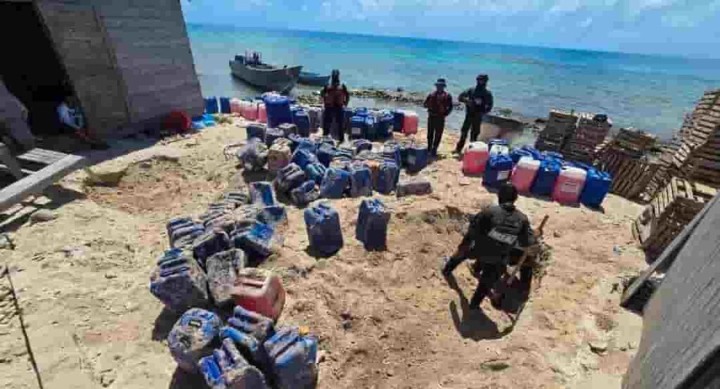 Durante labores de patrullaje en estos islotes —ubicados frente a la costa del departamento de Gracias a Dios, en la región de La Mosquitia—, efectivos navales localizaron 205 bidones con capacidad de 10 y 20 galones, muchos de ellos enterrados y ocultos, junto a un tanque tipo rotoplas, líneas de amarre y cajas de madera utilizadas para almacenar nasas.