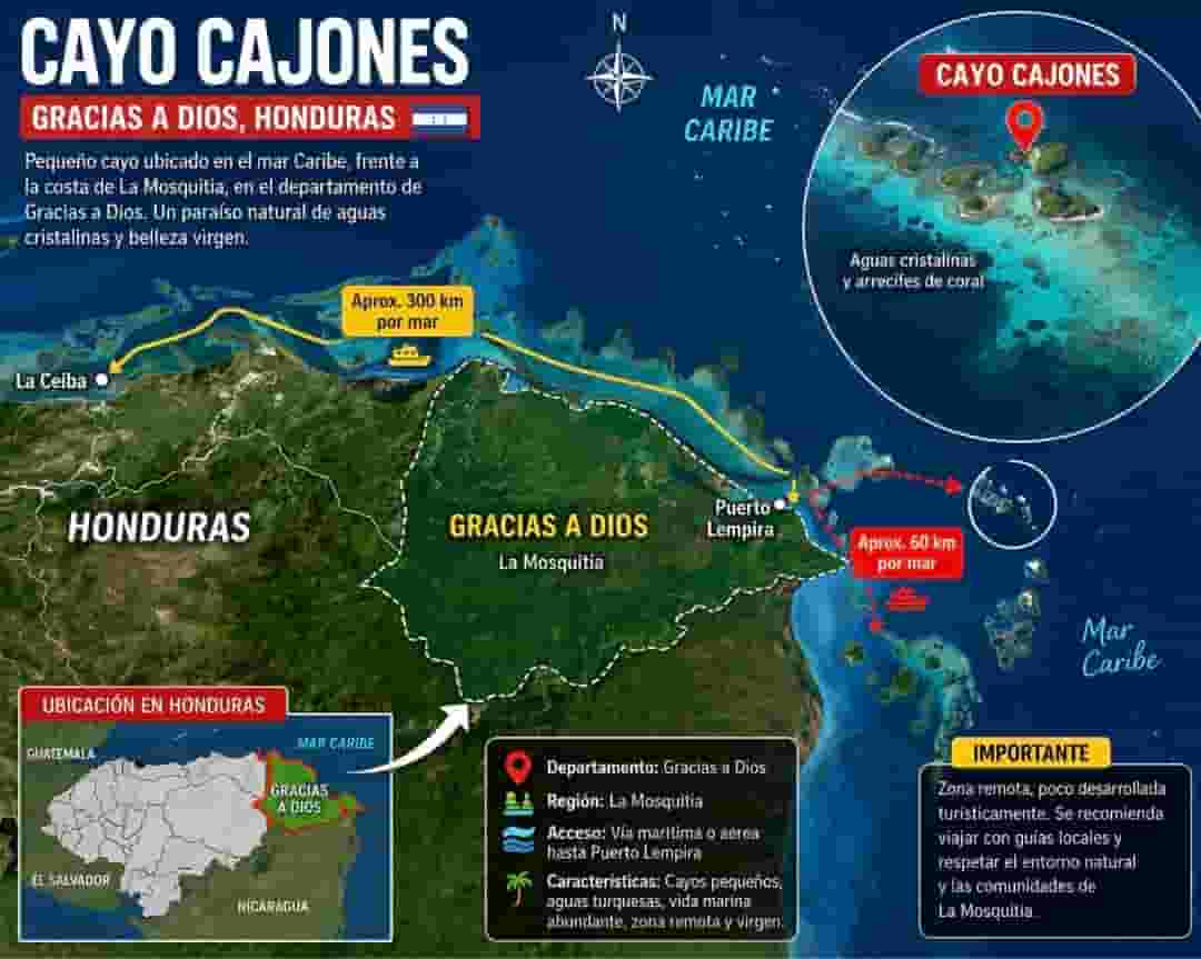 Cayos Cajones es una zona deshabitada, compuesta por pequeños islotes en mar abierto, utilizada principalmente por pescadores como punto de abastecimiento y resguardo de equipos como nasas, combustible y herramientas de faena.