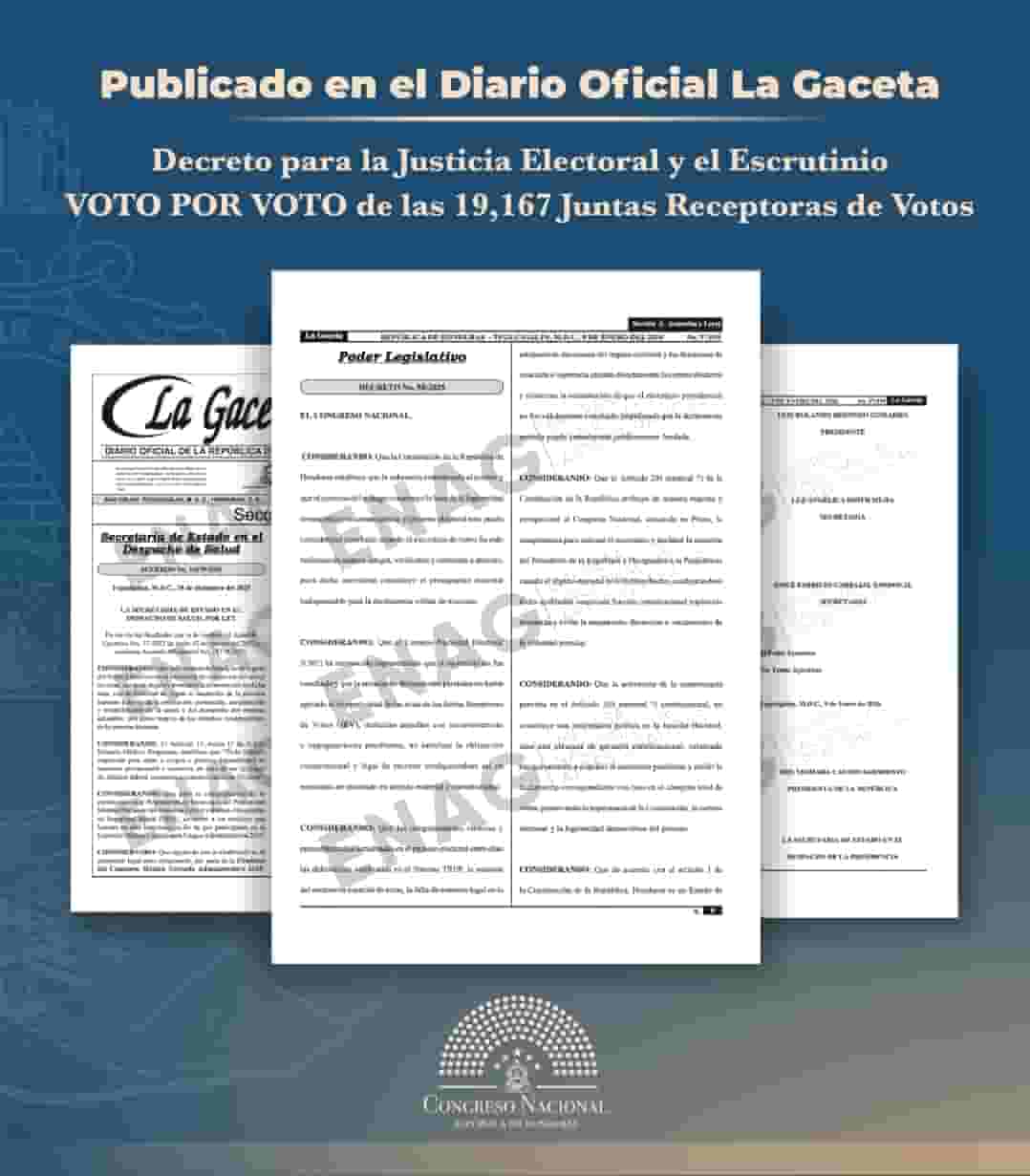 El decreto fue aprobado durante una sesión extraordinaria sin quórum, integrada mayoritariamente por diputados propietarios y suplentes del partido oficialista Libertad y Refundación (Libre), quienes además se abrogaron el derecho de emitir la declaratoria final de las elecciones generales, atribución que la Constitución reserva exclusivamente al Consejo Nacional Electoral (CNE).