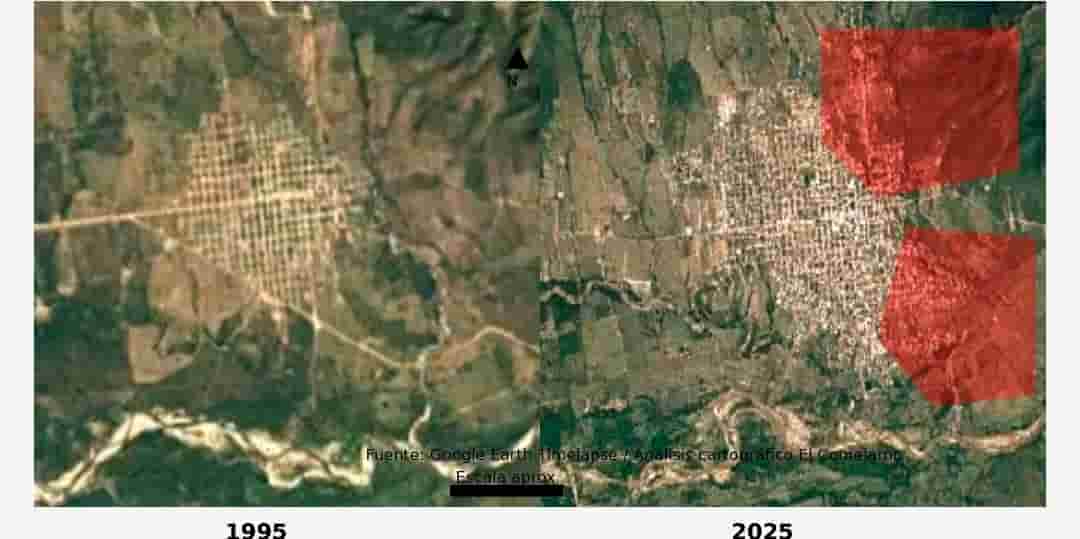 El análisis satelital permite observar con claridad cómo el trazado urbano ha ido avanzando progresivamente hacia sectores que hace apenas dos décadas eran utilizados como potreros o parcelas agrícolas, marcando así una nueva etapa en la configuración territorial del municipio.