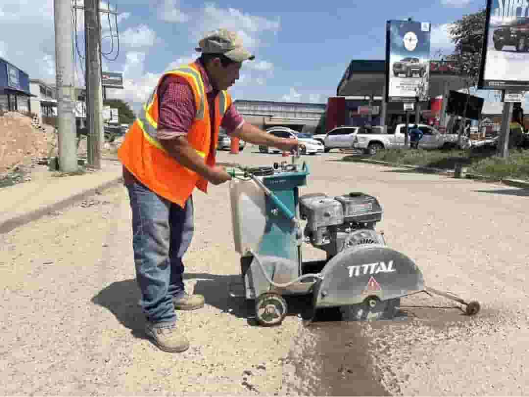 Las labores consisten en el retiro del material provisional que había sido colocado temporalmente, así como en el corte estructural del pavimento dañado para garantizar una mejor adherencia y durabilidad del nuevo asfalto.