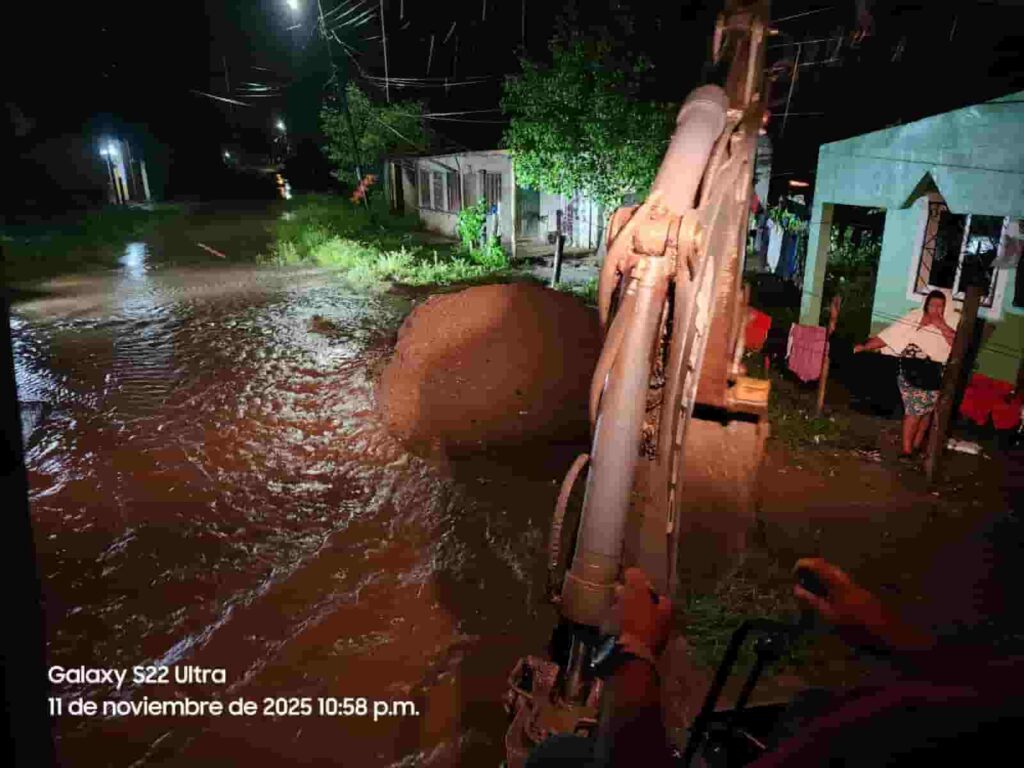 Personal de la alcaldía de Olanchito, junto a vecinos de las colonias 24 de Mayo y Betania, trabaja desde la noche pasada ayudando a familias cuyas viviendas han sido inundadas, utilizando maquinaria municipal para evacuar agua acumulada y mitigar daños.