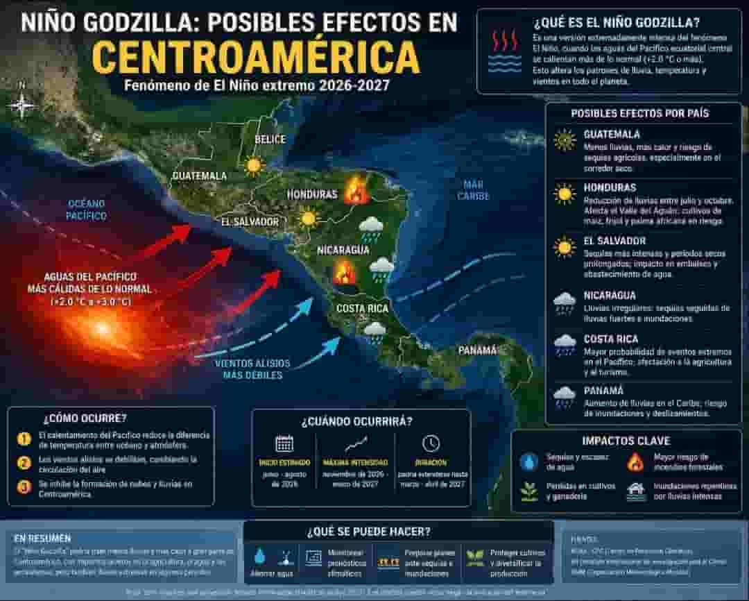 Un evento climático de gran magnitud, conocido popularmente como “Niño Godzilla”, podría desarrollarse entre 2026 y 2027, generando impactos enormes en los patrones de lluvia, temperatura y producción agrícola en la región centroamericana, según proyecciones de centros internacionales de monitoreo climático.