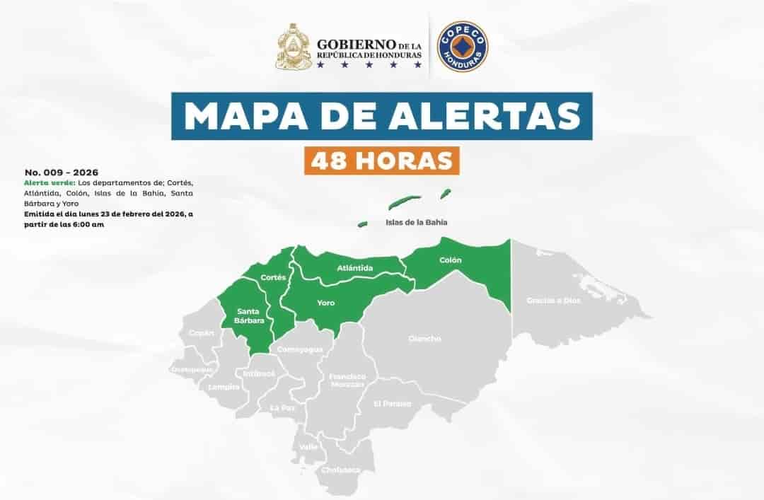 La medida preventiva abarca a los departamentos de Cortés, Atlántida, Colón, Islas de la Bahía, Santa Bárbara y Yoro, y estará vigente por un período de 48 horas a partir de las 6:00 de la mañana del lunes 23 de febrero, según el boletín oficial emitido por el organismo.