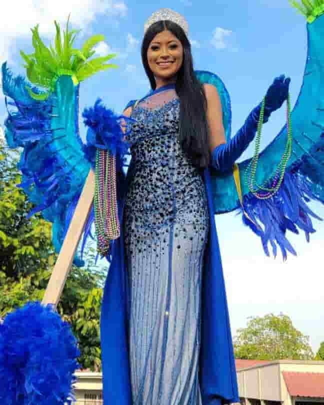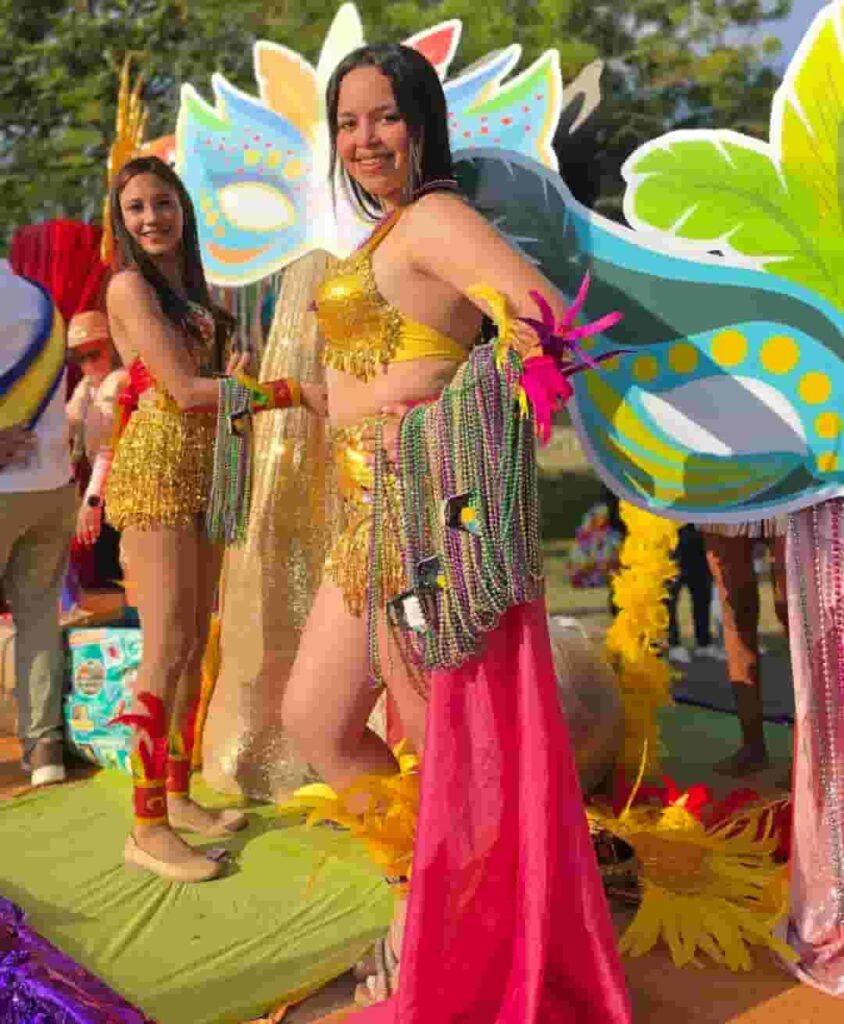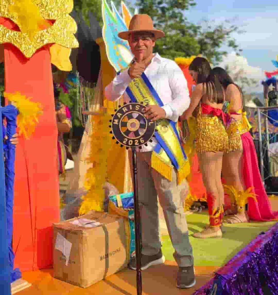 Entre los momentos más esperados destacó la aparición de la reina del carnaval, quien desfiló sobre una carroza adornada por el Club Rotario, saludando a los asistentes mientras a su alrededor predominaban los trajes brillantes, máscaras y elementos alusivos a la fiesta. Las jóvenes vestidas con atuendos dorados, cargadas de collares multicolores, sonrieron y bailaron reflejando el espíritu carnavalero.