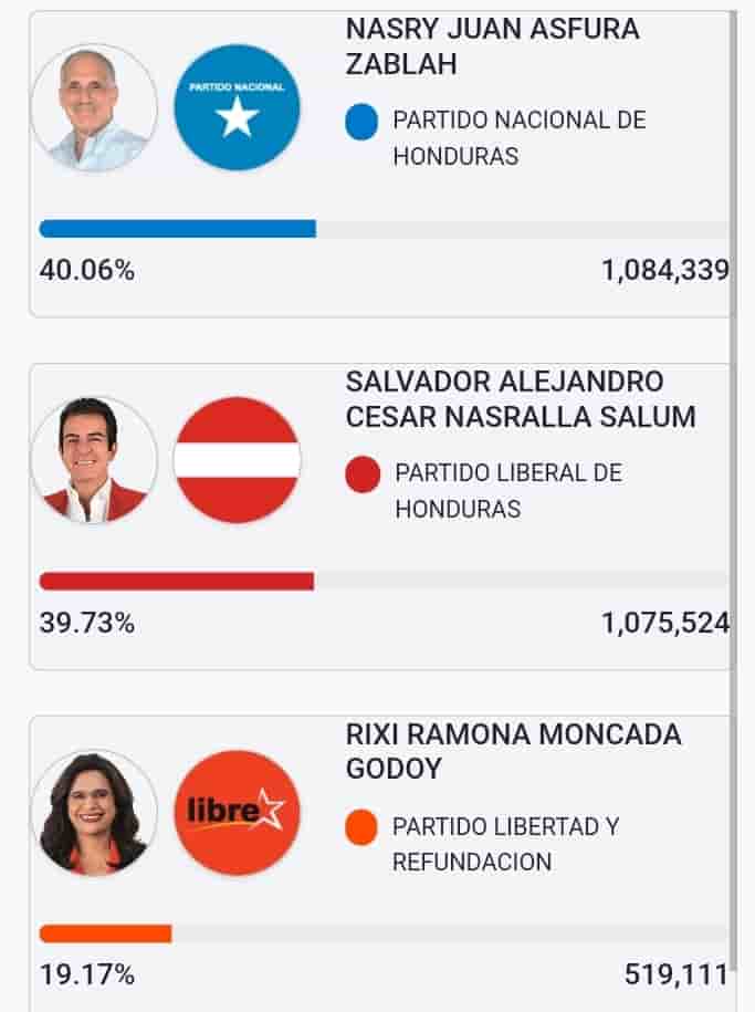 En la imagen, la plataforma nacionalista mantiene a Asfura como líder, con 1,432,957 votos (39.43%), ampliando la brecha respecto a los números del CNE.