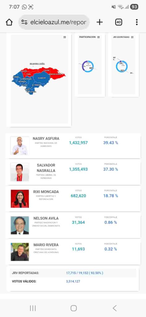 Según la herramienta del Partido Nacional —que reporta un 92.50% de JRV procesadas— Nasralla aparece con 1,355,493 votos (37.30%).