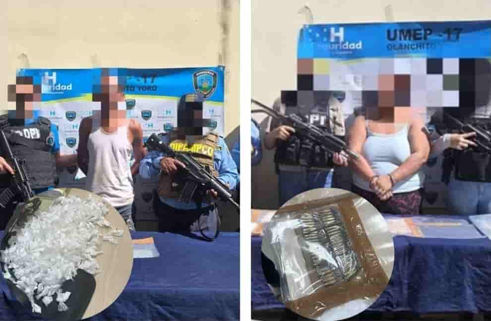 Agentes de la Policía Nacional capturaron este jueves a dos personas —un hombre y una mujer— durante un allanamiento ejecutado en la colonia 25 de Noviembre, en el municipio de Olanchito, a quienes se les supone responsables de delitos relacionados con el tráfico de drogas.