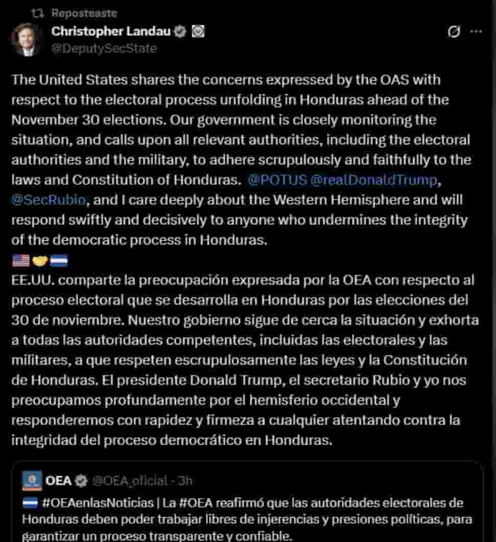 En un mensaje publicado en su cuenta oficial de X (antes Twitter), Landau afirmó que el gobierno norteamericano sigue de cerca la situación política en el país y exhortó a todas las autoridades hondureñas —tanto electorales como militares— a respetar las leyes y la Constitución de la República.